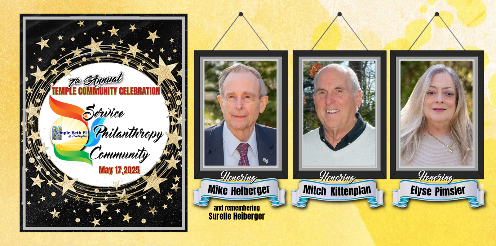 The theme for this year’s celebration is SERVICE • PHILANTHROPY • COMMUNITY.  We are honoring Mike Heiberger, Mitch Kittenplan, and Elyse Pimsler for their many years of dedicated service to our congregation.